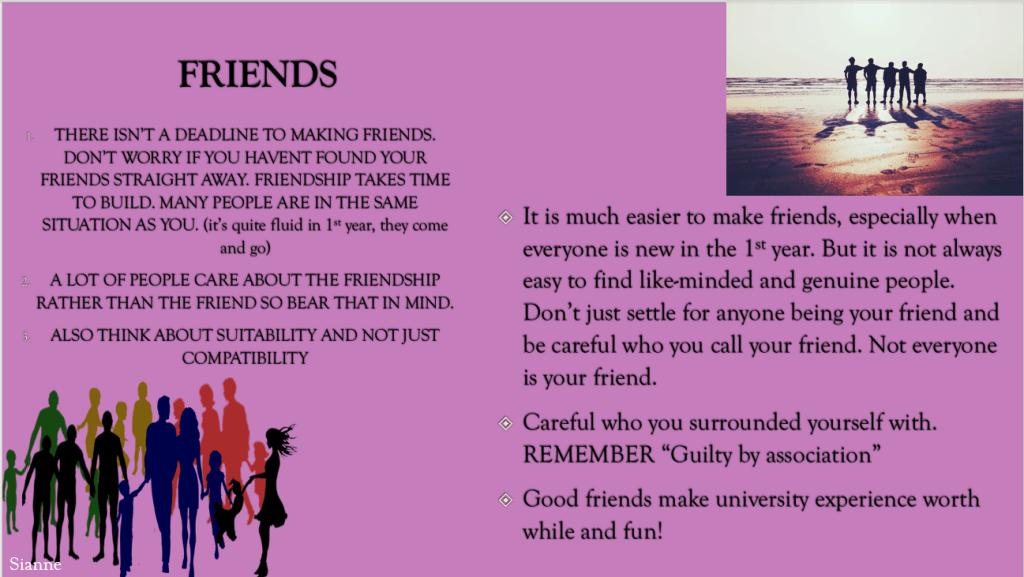 *PEER PRESSURE: don’t feel like you must go out all the time, especially during freshers. Things calm down once the season of freshers expires. If you don’t feel like going, don’t force yourself or be pressured into going. Do what makes you feel comfortable.