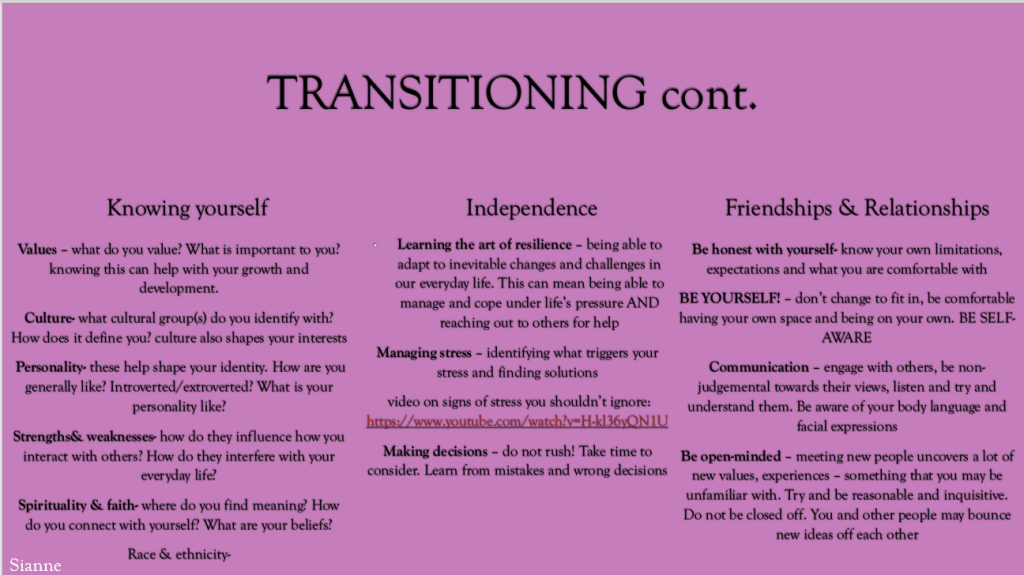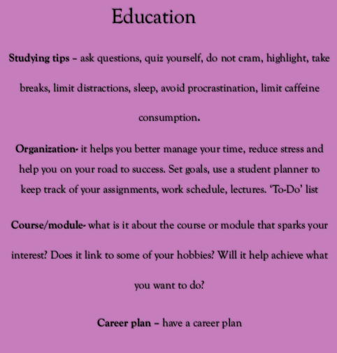 *LIFESTYLE AND SOCIALISING: sometimes university can change your usual routine. Make sure you find time to balance your personal, social and university life so there is some structure in your life.