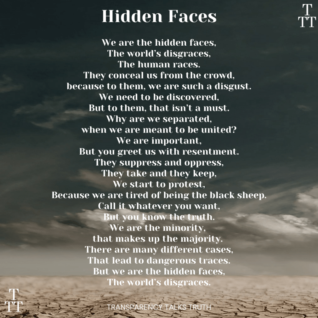 This poem doesn’t necessarily relate to me but this is a poem about the people who feel voiceless, hidden and marginalised in today’s society. You may even feel like this in your own family! Some of you may understand and relate to it in your own way. I know some things written in this piece touched me.